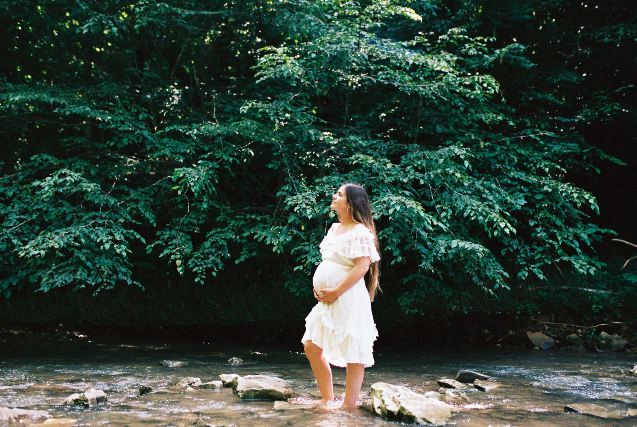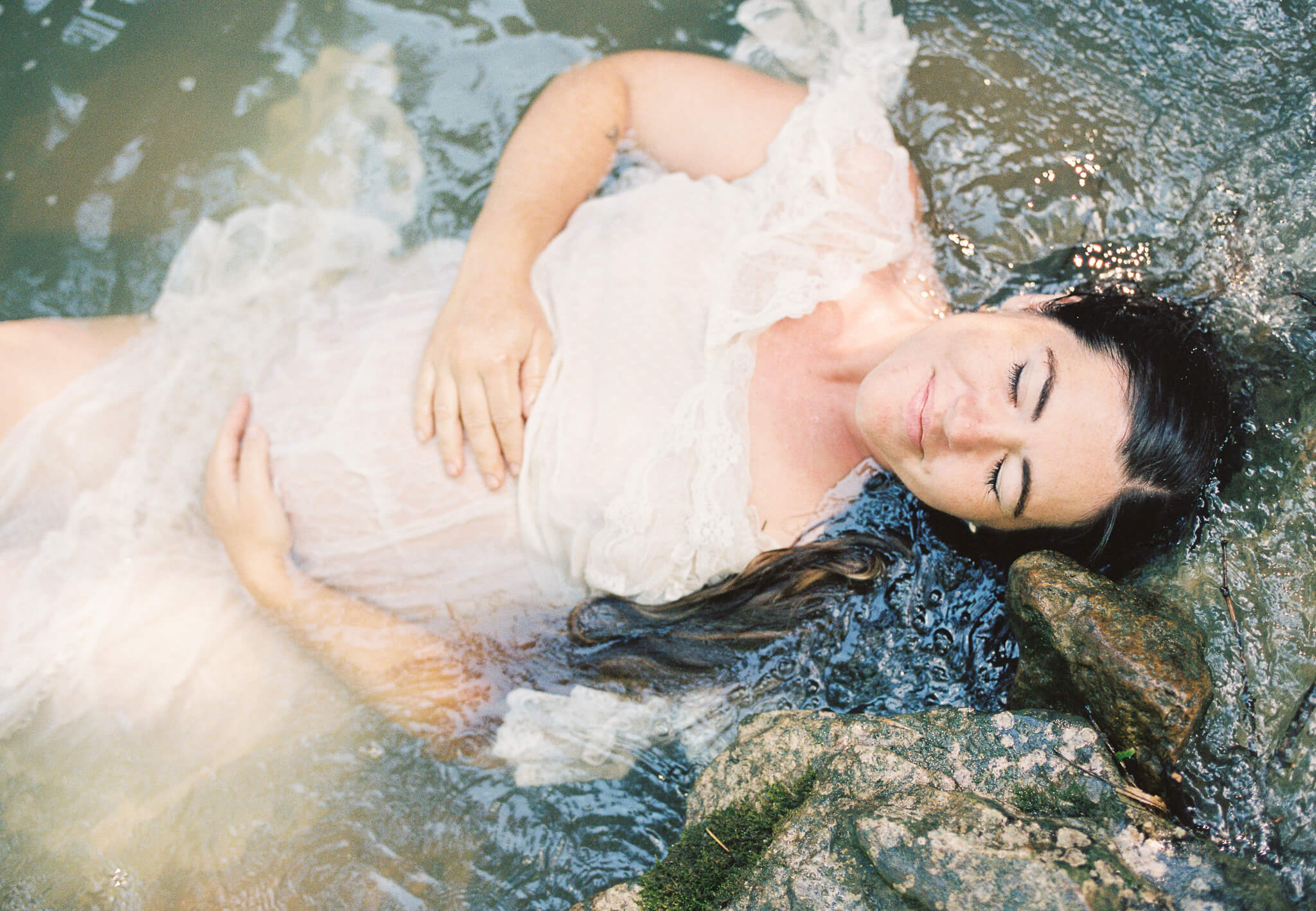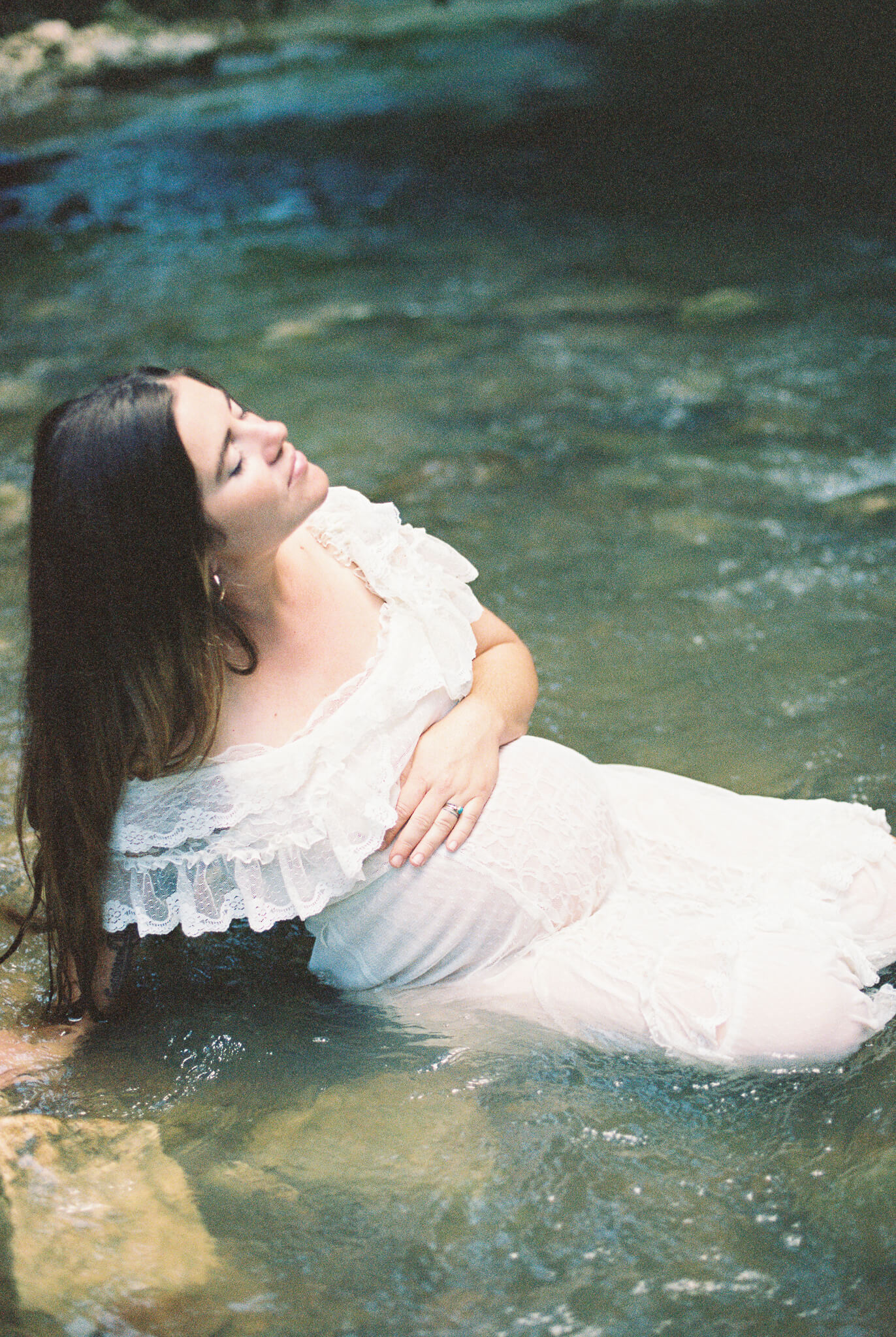 To say these photos were life-giving is not and understatement. It was such a pleasure to witness my friend and muse Senora May in her growth into motherhood. And my word–how beautiful does she looking growing into it? While looking back, I can still feel the rush of cold water on my feet and I can still hear the sounds of the wind in the trees, the babbling creek, and joyous laughter. Upon first look I audibly gasped and squealed in delight at some of these beautiful scans. (Shout out to my wonderful scanning techs over at The Find Lab!)